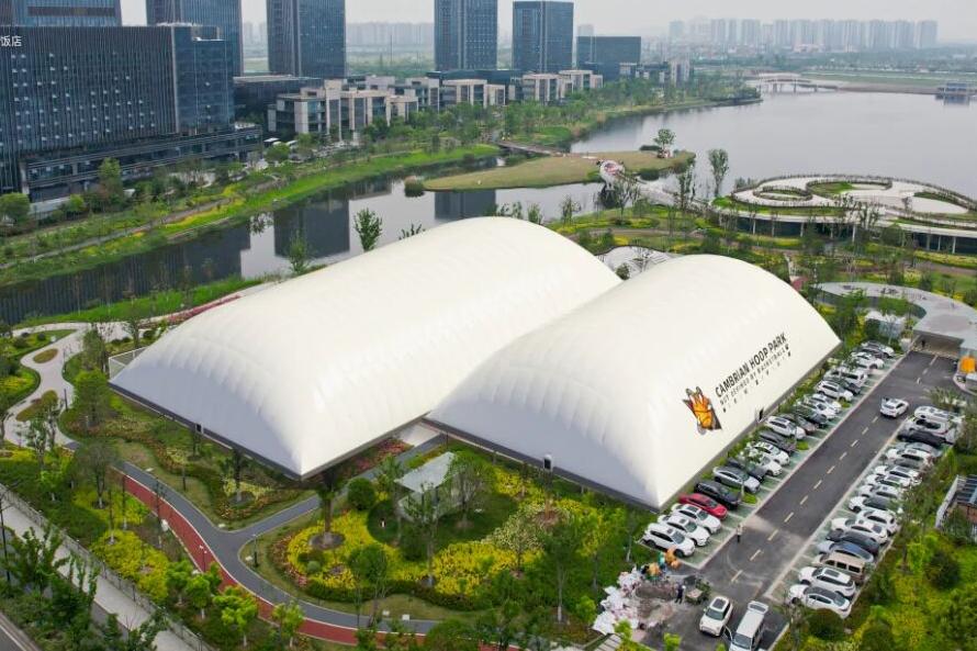 钱塘区首个面向公众开放的气膜运动馆-东沙湖气膜运动馆,场馆内设羽毛球场、网球场、篮球场三大运动区域。