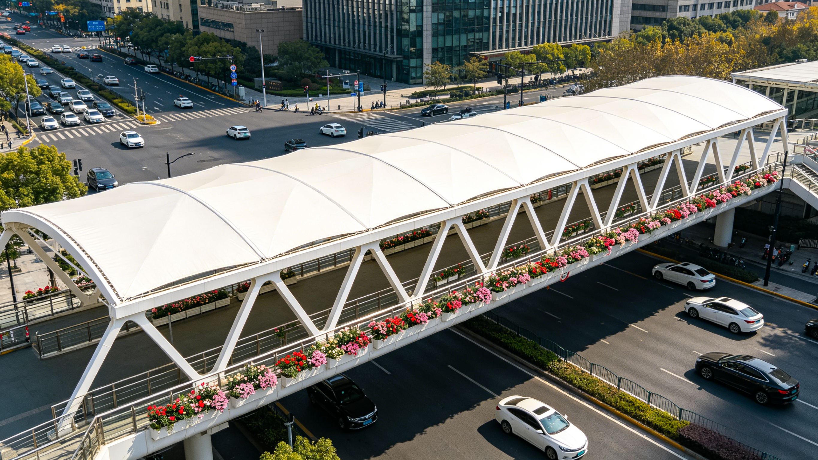 城市天桥钢架膜结构连廊可实现大跨度无柱设计,造型可塑性极强,作为景观节点可提升市容风貌。具备优异的自洁性、耐候性,抗紫外线、防水防腐,雨水冲刷即可保持洁净。抗风、抗震性能达标膜材可回收利用,符合低碳环保理念,契合现代绿色城市建设需求。¥ 0.00立即购买