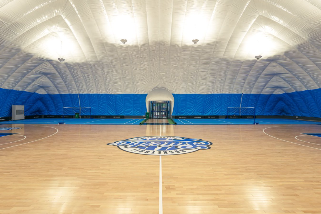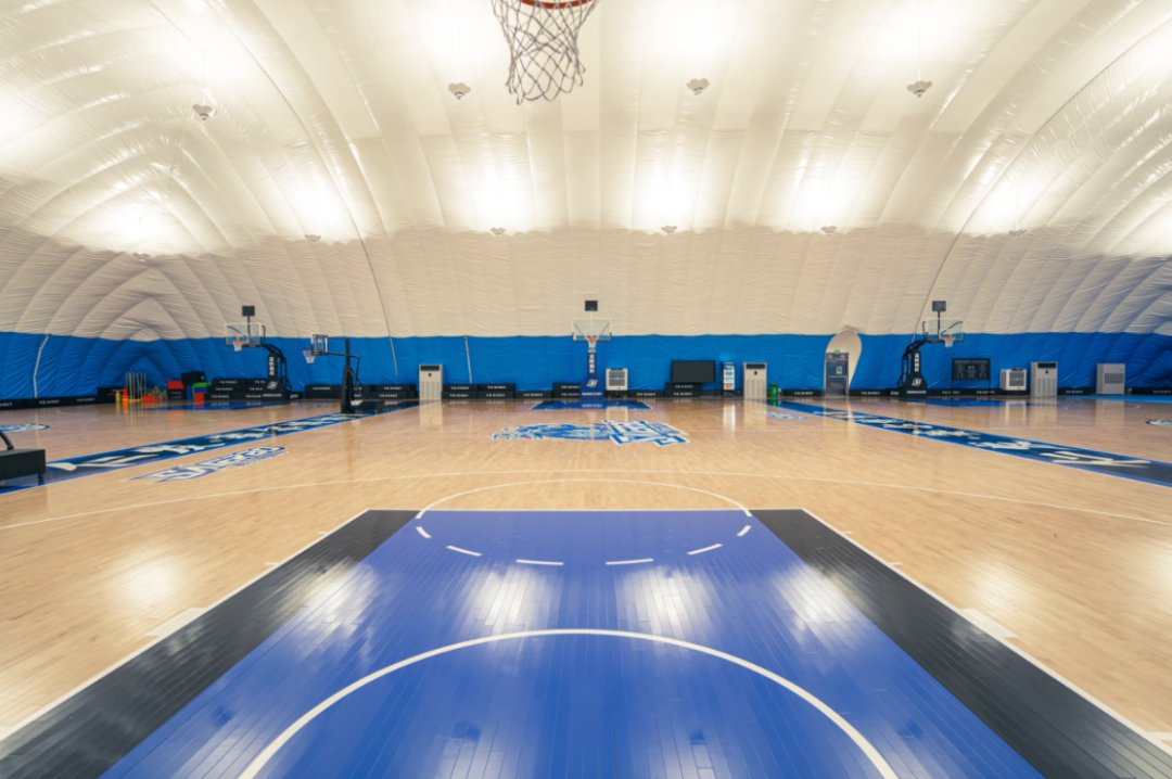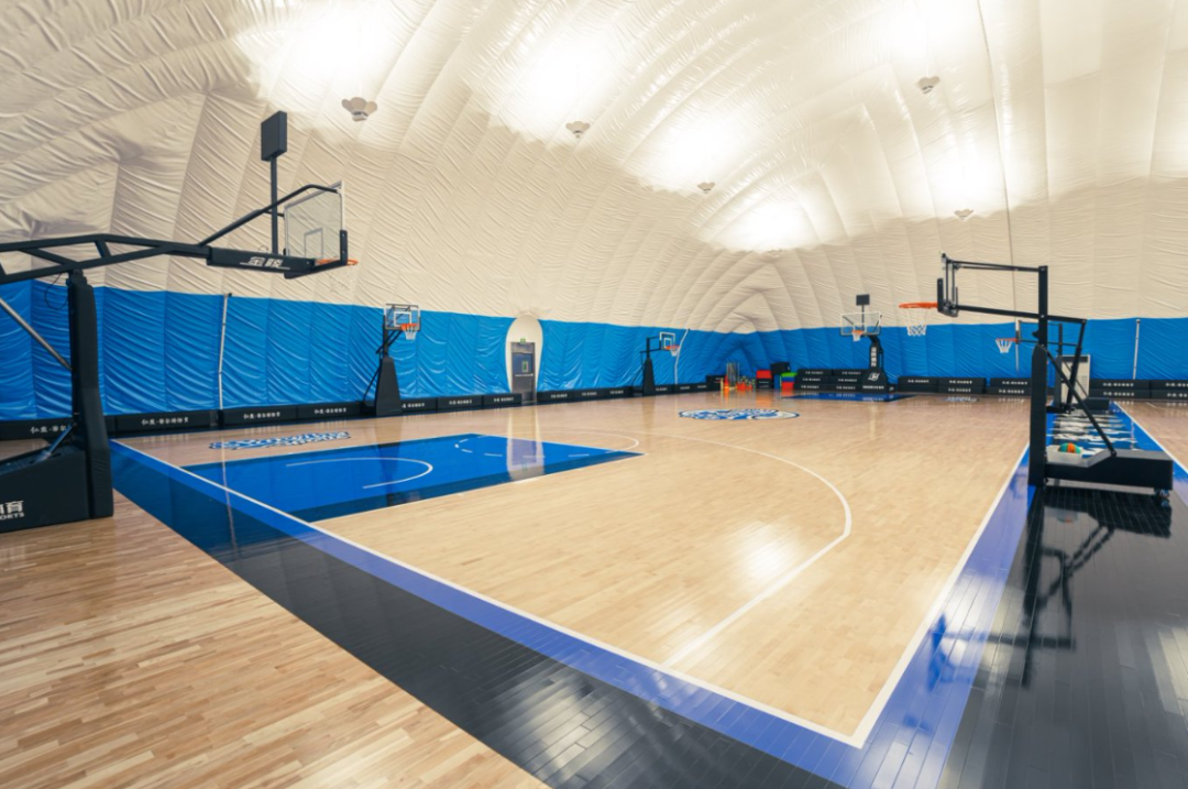 烟台地区首家气膜式篮球馆,馆内面积约2160㎡,无梁无柱视野开阔,全年恒温恒湿。