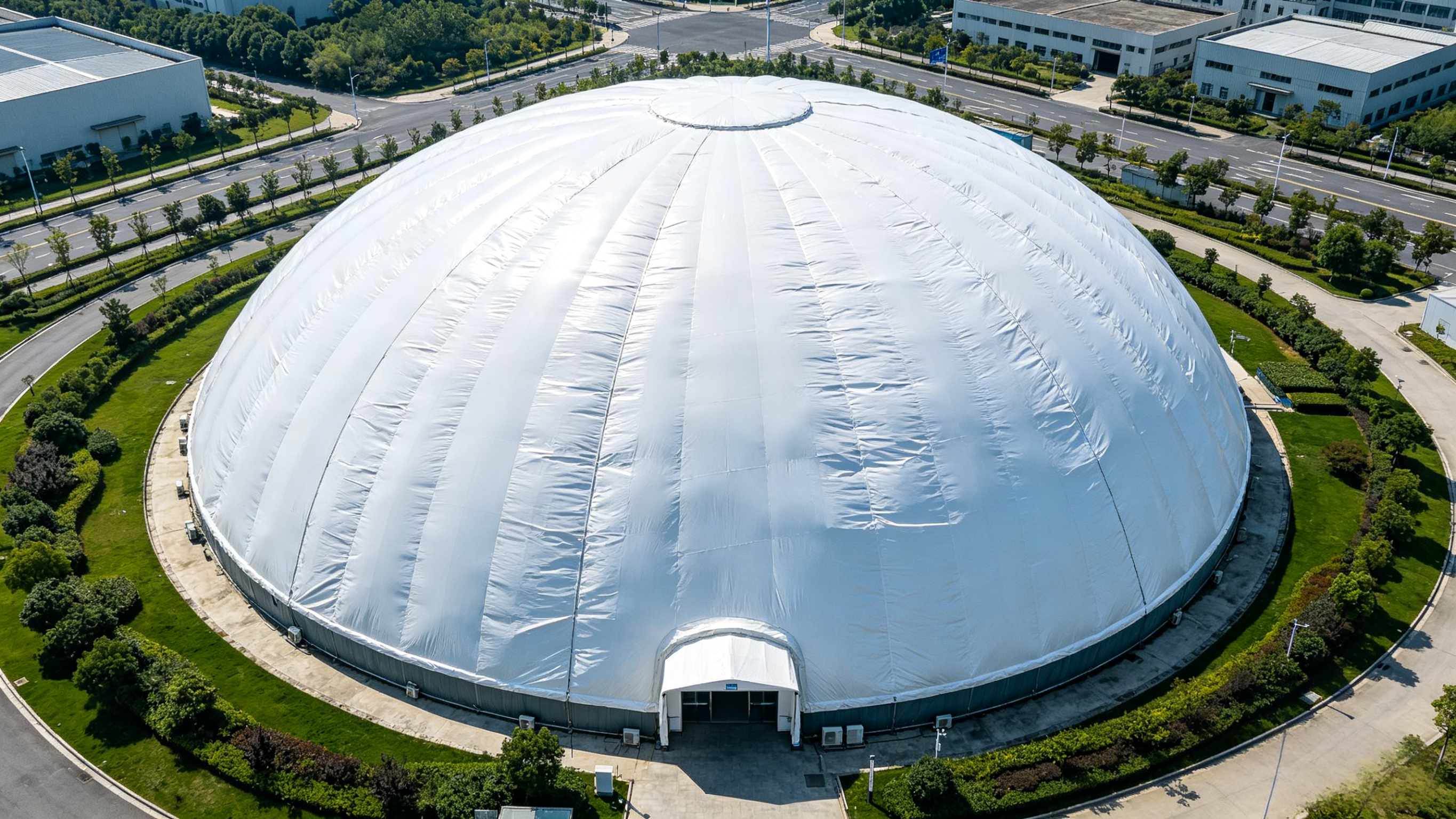 气膜是采用空气支撑膜材从而构建空间的一种建筑,无钢筋混凝土,无梁无柱,最大特点就是构建速度快,且易于拆卸搬迁,同等规模投入成本低,还可以循环利用,是真正的绿色低碳建筑。