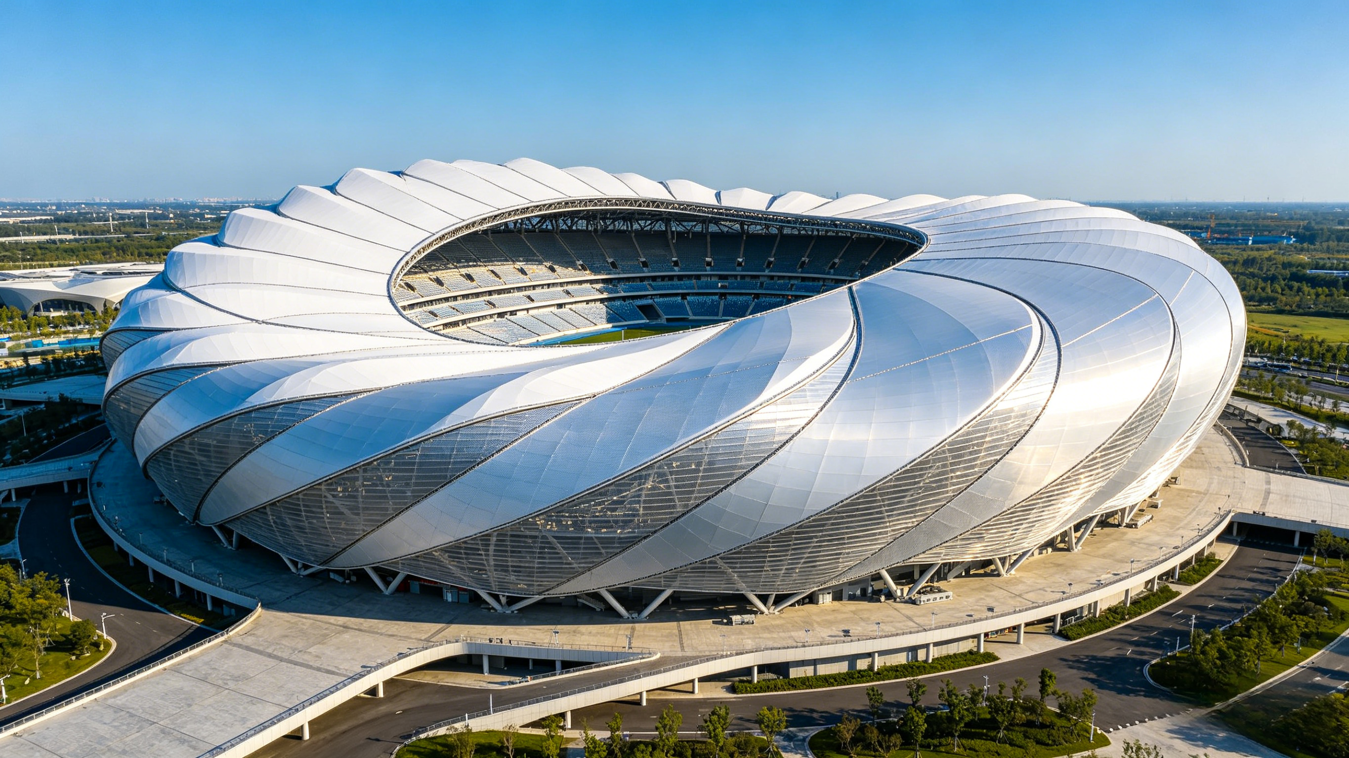 钢膜体育场采用索膜结构。屋面结构由悬臂钢梁支撑,杆上覆盖PTFE膜结构,沿外立面向屋面结构延伸。日间,膜材提供了遮阳挡雨的作用;夜幕降临时,场馆内部的照明穿透半透明膜材,弥漫出柔和的光。这样膜材不仅能打造场馆的外观照明效果,还能将光线反射至场内,为看台区域提供均匀舒适的照明。